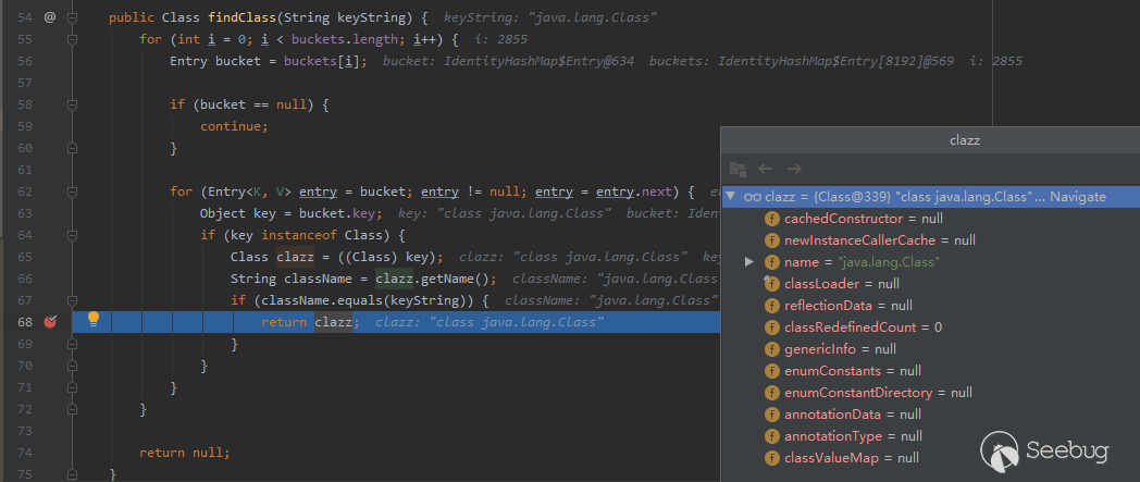 從上圖代碼可見,程序會遍歷buckets,取出其中元素的key屬性值的名稱并與傳入的”java.lang.Class”進行比較,如果二者相同,則將這個Class對象返回。
