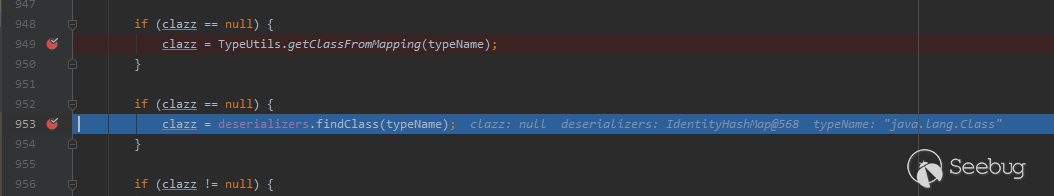 在弄清楚mappings列表的由來后,繼續回到正題。我們構造的typeName(@type指定的"java.lang.Class")并不在Mappings的鍵中。因此getClassFromMapping方法返回null,程序繼續向下執行進入下一個if分支。此時程序接著調用deserializers.findClass對傳入的typeName進行解析。