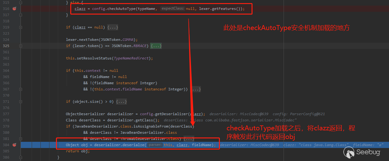 從上圖第一個紅框可見,checkAutoType在將用戶傳入的@type值返回后,程序會賦值給上圖316行處clazz變量,而上圖384行處的deserialze方法緊接著處理這個clazz變量。