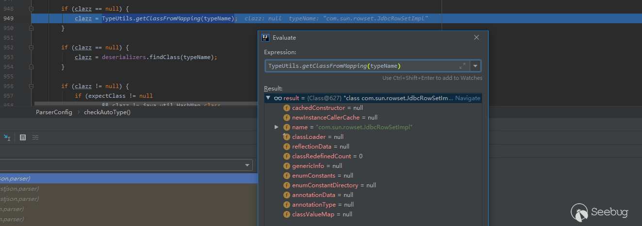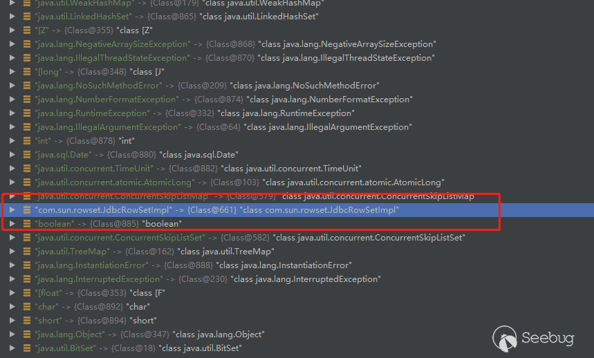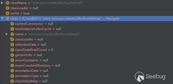 由于這次Mapping中有鍵名為com.sun.rowset.JdbcRowSetImpl的元素,因此clazz被賦值為com.sun.rowset.JdbcRowSetImpl類對象。