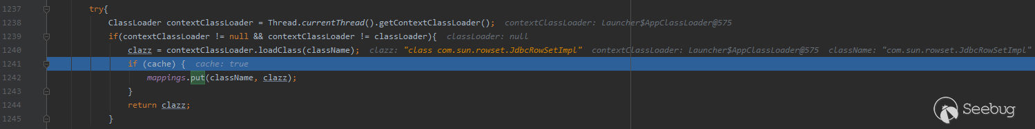 loadClass接收的一個參數:"className"為String類型變量,根據上文的調用關系,這里傳入的是字符串"com.sun.rowset.JdbcRowSetImpl",即className參數值為"com.sun.rowset.JdbcRowSetImpl"。