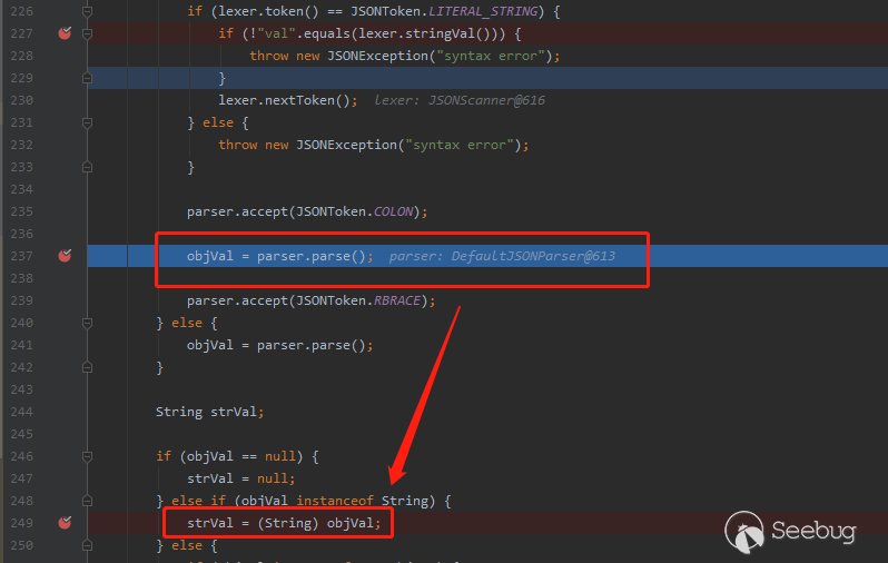 在這段代碼中,程序將判斷傳入的json字符串中是否有”val”,并將其值通過下圖第一個紅框處的代碼取出賦值給objVal變量。