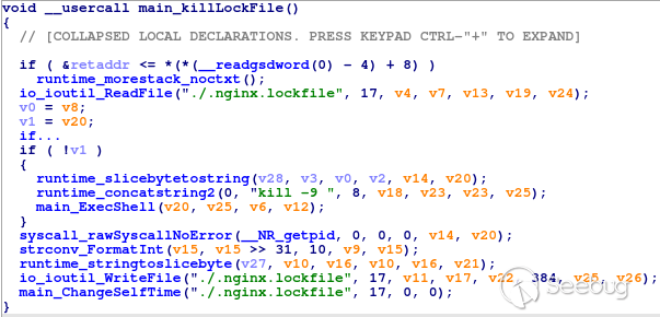 有趣的是,Guard和RAT都執行了singleton屬性,這意味著該設備上只能運行單個惡意軟件。該惡意軟件使用兩種方法來保持唯一。首先,它將PID存儲在lock file中,從而使其可以終止新的相同進程。其次,它檢查運行過程以識別同一惡意軟件的其他實例。