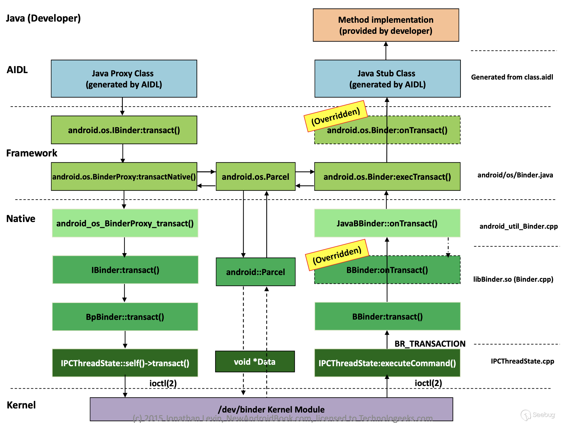 從驅動的層面看,Binder的使用也很簡單:使用open(2)系統調用打開/dev/binder,然后使用ioctl(2)系統調用進行數據傳輸。以前面的AIDL IPC為例,其底層的實現如下圖所示: