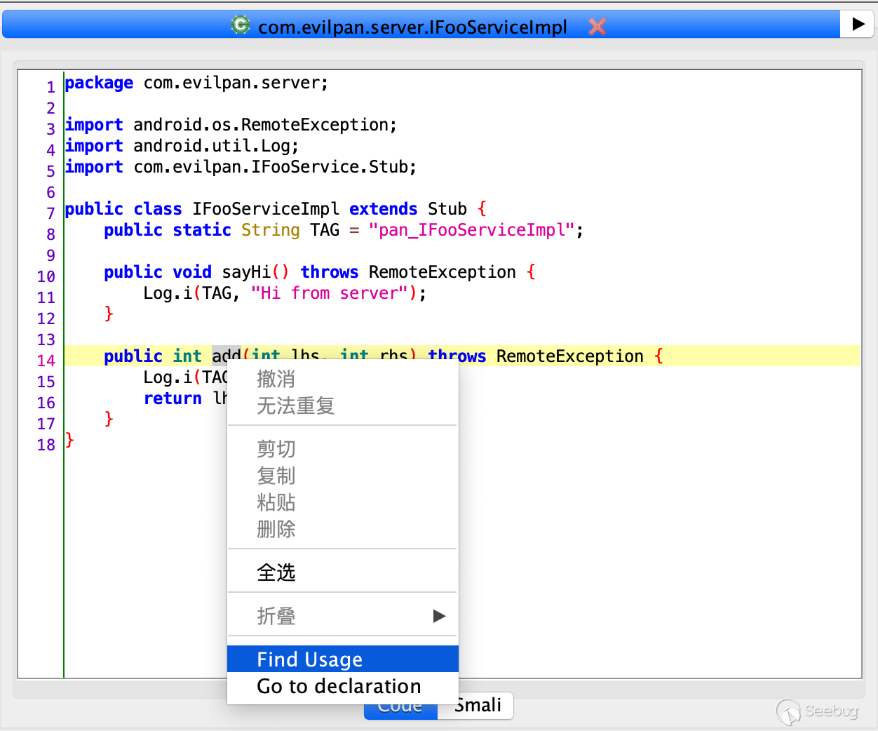 假設我們正在逆向分析上面編譯好的APK,在找到某個關鍵函數(比如add)后Find Usage發現沒有任何交叉引用,但實際上這個函數是被調用了的。那么這就有幾種可能,比如這個函數是通過反射調用的,或者這個函數是在native代碼中調用的。……當然這里實際上是父類中進行多態調用的,本質是Binder喚起的遠程調用。