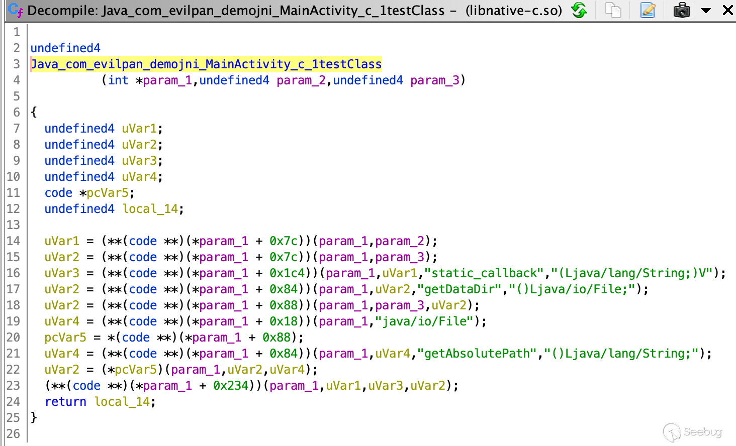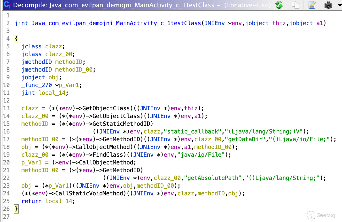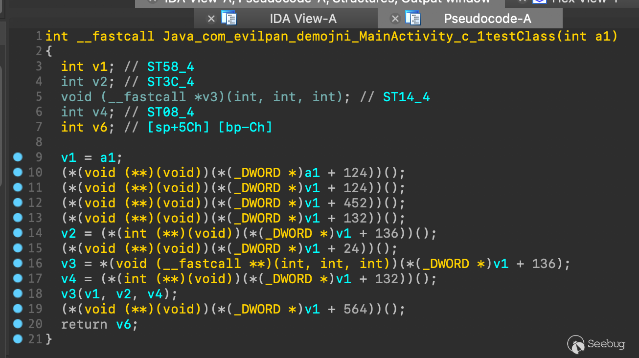 平時進行安卓逆向時,一個常見的場景就是目標把關鍵邏輯放到 Native 代碼中,使用 JNI 接口進行實現。進行分析一般是把對應的動態庫so拖進逆向工具中,然后定位具體的 Native 實現,再對參數類型、JNI 調用等邏輯進行一些優化方便對反匯編/反編譯代碼的理解。比如對于大家常用的 IDA-Pro 就是 Parse C Header 加載 jni_all.h,然后修改 JNI 接口的函數原型和變量結構。