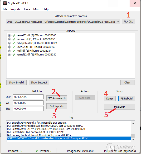 重新啟動程序后,我們再次在VirtualProtect上放置一個斷點,并使該斷點命中八次。然后,我們將EIP設置為該地址,并使用x64dbg的內置Scylla插件轉儲二進制文件并修復其導入: