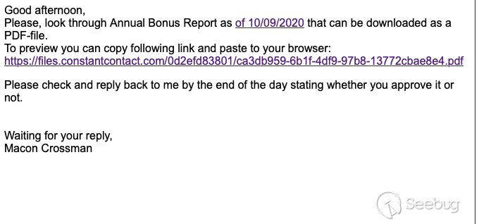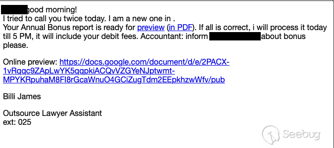 我們在同一時期從Sophos的垃圾郵件攻擊事件中收集了來自同一黑客的其他郵件。這些郵件使用Google Docs形式,通過商業電子郵件分發,這進一步掩蓋了惡意文檔來源。