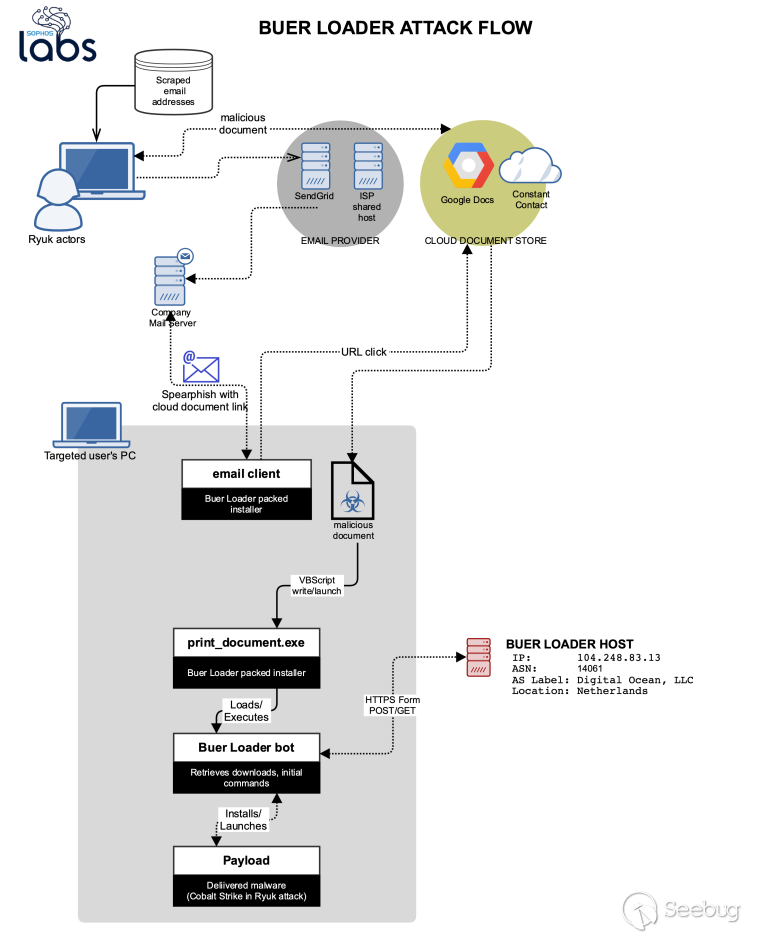 Sophos快速響應小組發現了9月Ryuk襲擊的根本原因:Buer樣本。加載程序是通過存儲在Google上的惡意文檔交付的,該文檔要求受害者啟用腳本內容才能激活,這種行為類似于Emotet等通過惡意垃圾郵件的攻擊事件,但云存儲使取證分析更加困難。