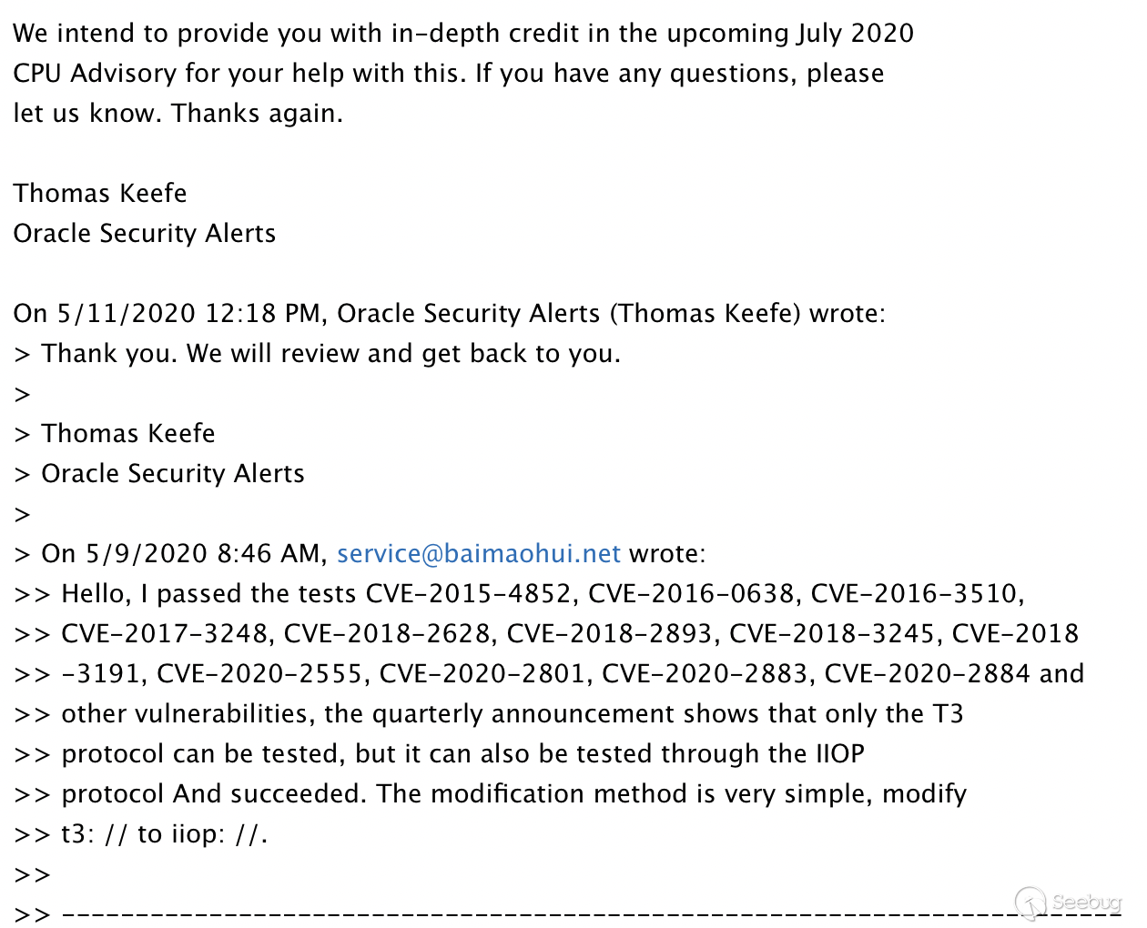 T3 協議本質上 RMI 中傳輸數據使用的協議,但通過上面我們看到 RMI-IIOP 是可以兼容 RMI 和 IIOP 的,所以在 Weblogic 中只要可以通過 T3 序列化惡意代碼的都可以通過 IIOP 協議進行序列化,正是因為這種情況,我進入 Weblogic 第三季度深度貢獻者名單。