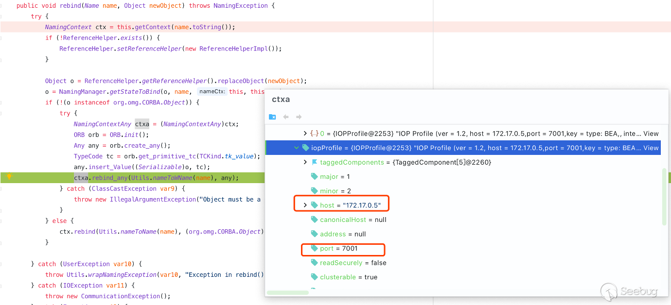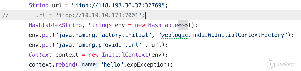 首先修改 weblogic.corba.j2ee.naming.ContextImpl 類中 rebind 方法將正確的連接 IP 和端口加入到系統環境變量中。