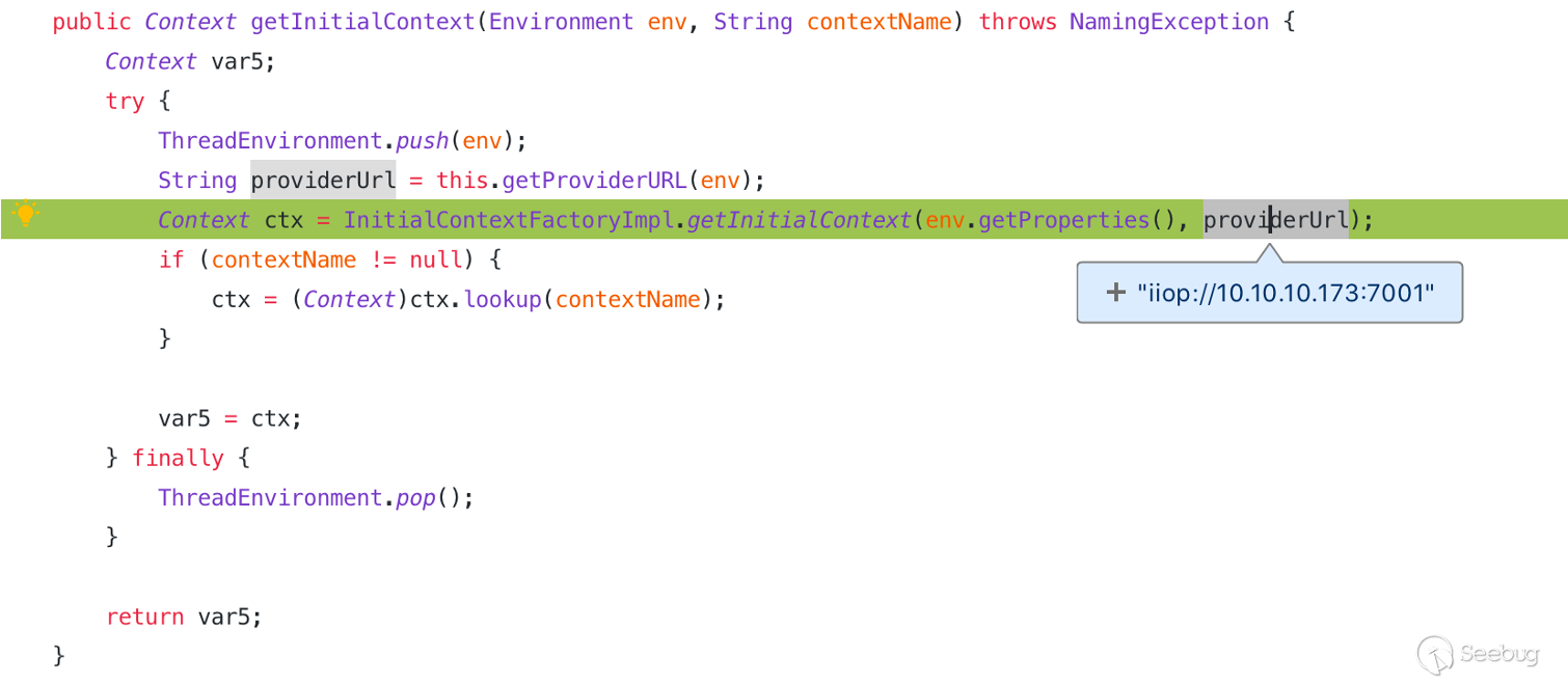 初始化上下文通過攻擊流程中的 new InitialContext(env) 進行構建,最終的入口點通過 getInitialContext 方法進行構建,最終是進行流入到 InitialContextFactoryImpl.getInitialContext 進行初始化上下文。
