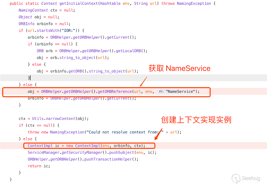 在流入 InitialContextFactoryImpl.getInitialContext 之后會通過 obj = ORBHelper.getORBHelper().getORBReference 來進行獲取 NameService,然后將獲取到的 NameService 進行實例化創建上下文實例,提供后續的執行操作。