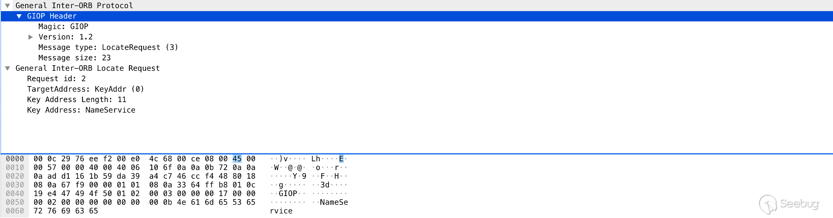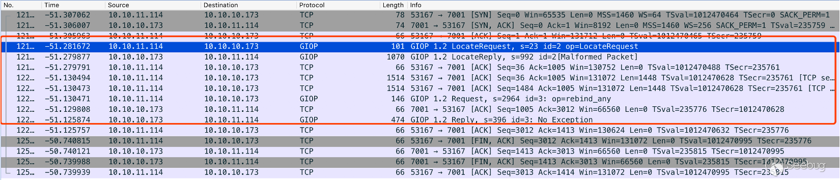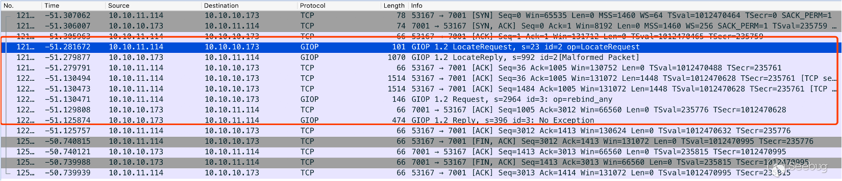通過 Wireshark 進行抓包可以,可以看到一共通訊了 2 次,第一次發送 LocateRequest 類型的 LocateRequest 的通訊操作獲取 NameService,第二次發送 Request 類型的 rebind_any 操作進行發送序列化代碼。