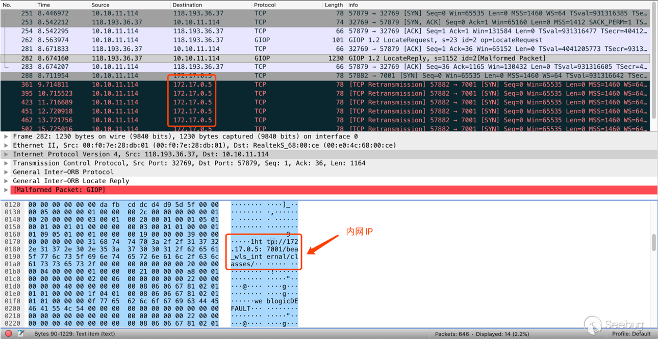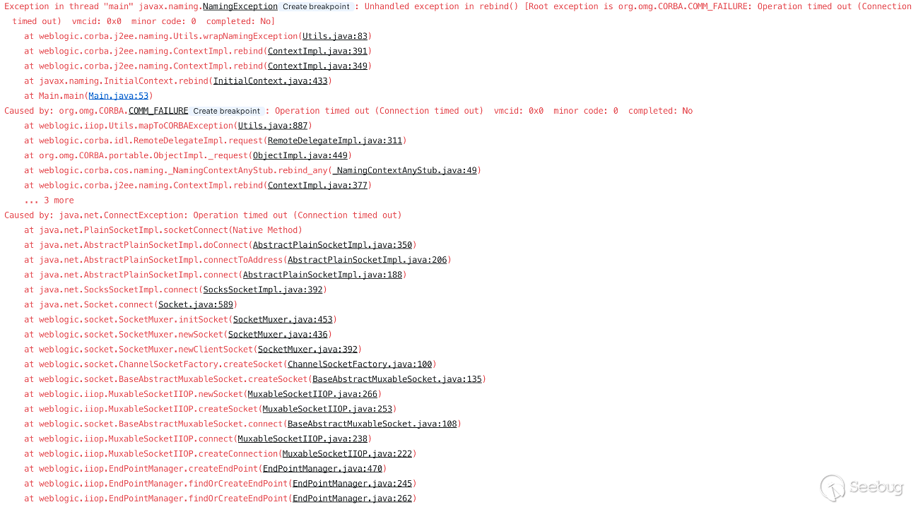 在執行 rebind 方法發送序列化代碼時,可以看到在此時已經變成了 Weblogic 內網中運行的 IP 和 端口,直到程序執行到 createEndPoint 拋出異常。