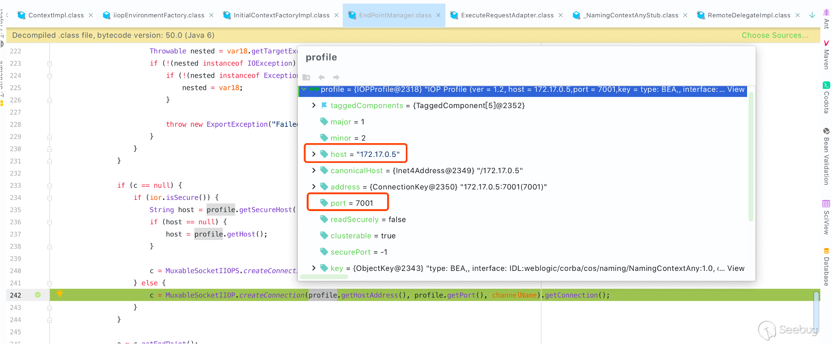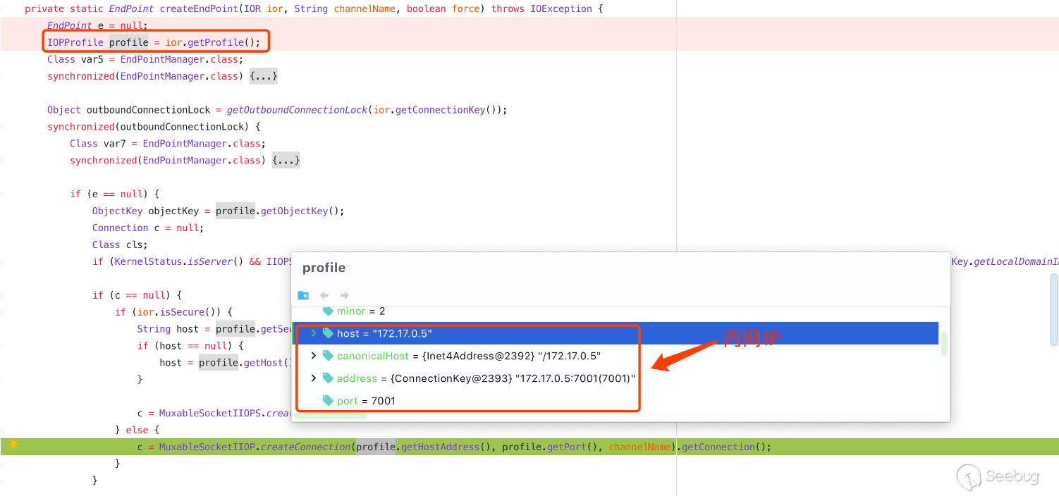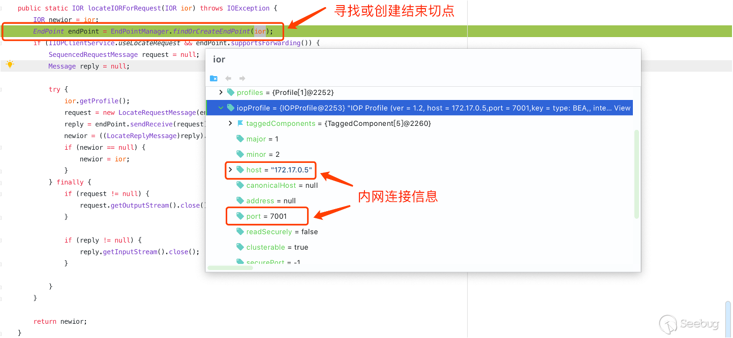 在進入 locateIORForRequest 方法之后會通過 EndPointManager.findOrCreateEndPoint 來進行尋找或創建結束切點,可以看到此時 IOR 的 host、port 變成了內網中的 IP 和端口。