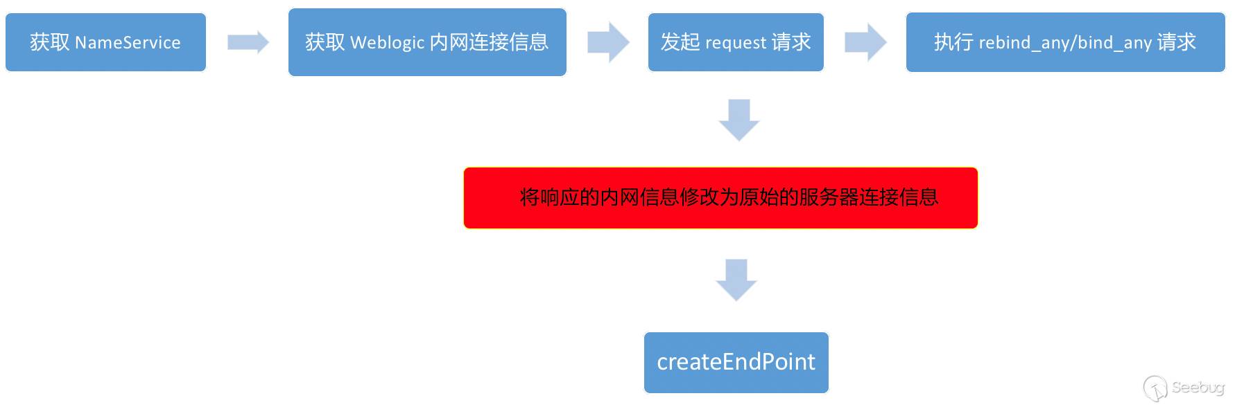 由于問題發生在響應的 Weblogic 在獲取 NameService 時,響應的 IP和端口為內網中的端口,導致在后續 createEndPoint 建立 Socket 通信,所以我們可以進行在建立 Socket 通信之前修改為正確的 IP和端口(公網中的IP和端口)。