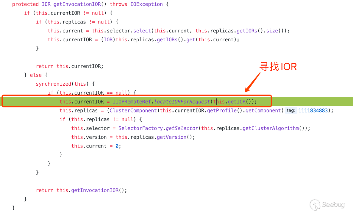 而執行到 getInvocationIOR 方法時,會調用 IIOPRemoteRef.locateIORForRequest 方法來進行尋找 IOR,并且將尋找到的 IOR 設置為當作當前 IOR 進行返回提供使用。