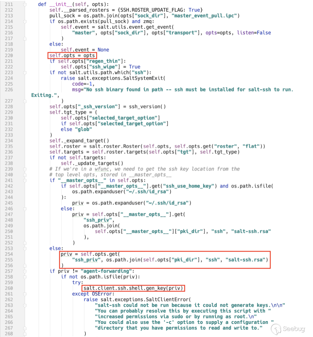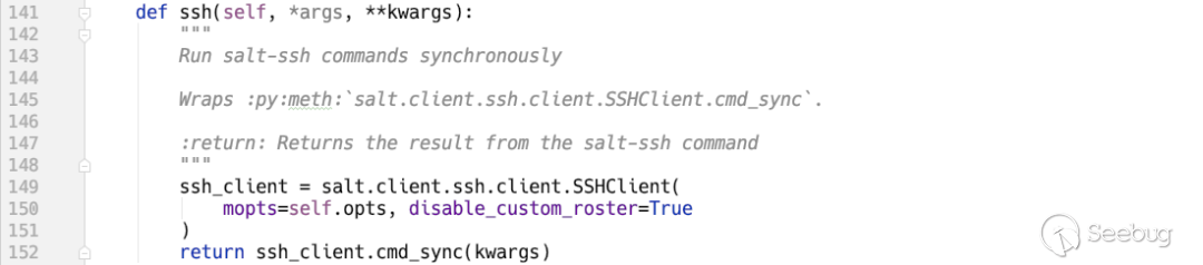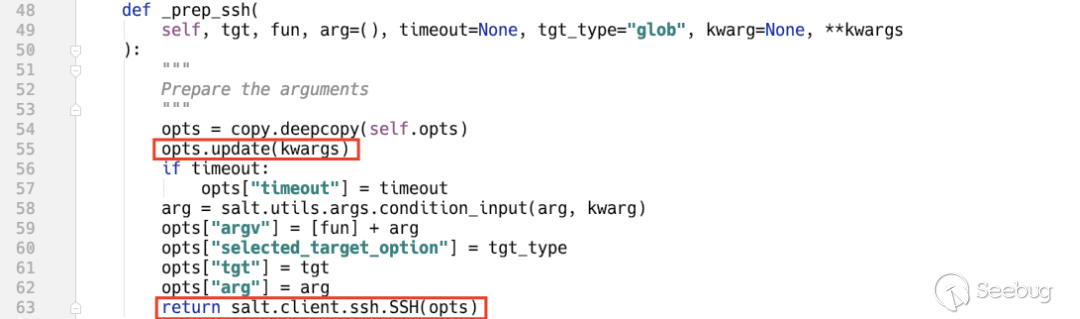 該方法將kwargs外部可控參數更新值opts變量,該變量可以理解為SaltStack系統的環境變量,使用該變量初始化salt.client.ssh.SSH。