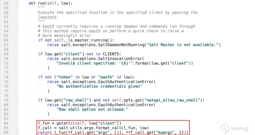 salt-api REST接口默認使用cherrypy框架,從run接口的實現上可以看出通過client參數動態調用NetapiClient類中的方法。