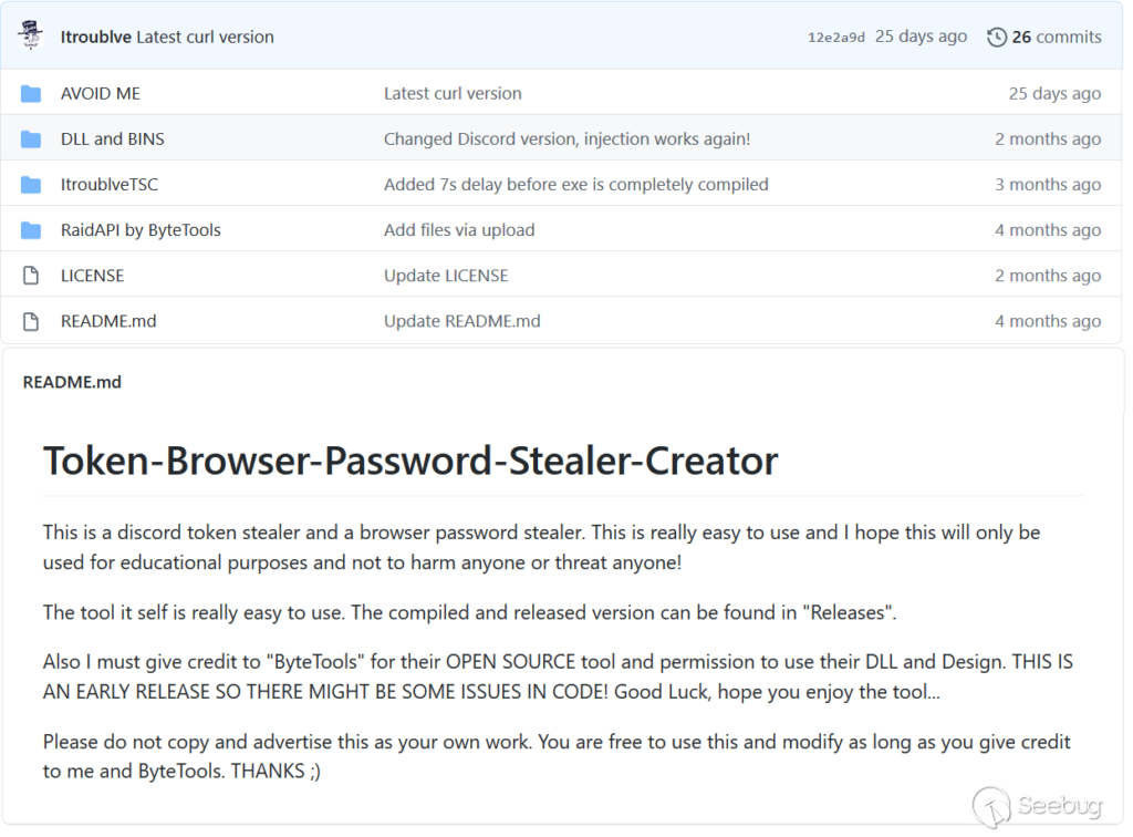 我們從https://github.com/Itroublve/Token-Browser-Password-Stealer-Creator/releases/tag/5.1位置下載了最新版本ItroublveTSC V5.1。該軟件包包含惡意軟件的生成器及其組件。