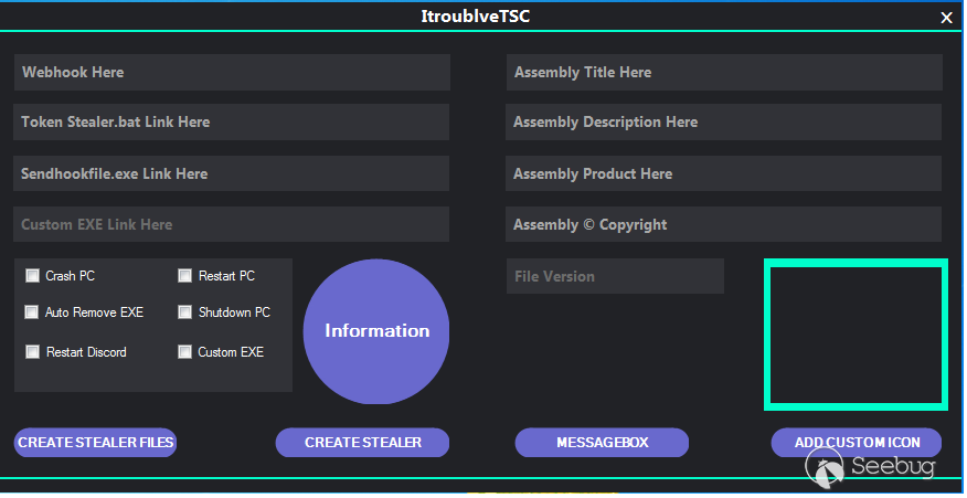 sendhookfile.exe和Token Stealer.bat到任何文件共享應用程序,并將鏈接粘貼到生成器中。 - 用戶還可以輸入假消息框,添加自定義圖標,輸入文件詳細信息,并選擇其他選項,包括