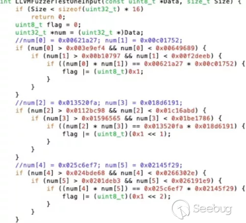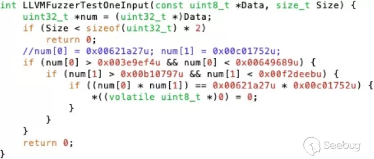 AFL采用的是反饋驅動的遺傳算法。其反饋信息中不包含任何條件信息,無法構造滿足特定條件的數據,完全靠碰撞。當遇到32位整型條件時,碰撞概率為2的32次方分之一,幾乎不可能碰撞成功。