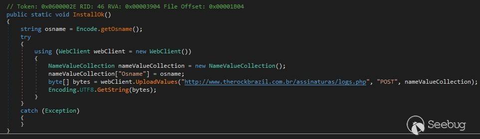 隨后,該惡意軟件重復刪除系統事件日志和Shadow Copy副本的相同過程,該過程在開始時執行。然后它發送一個帶有受害者計算機名稱的HTTP POST請求到位于hxxp://www.therockbrazil.com.br/assinaturas/logs.php的服務器。