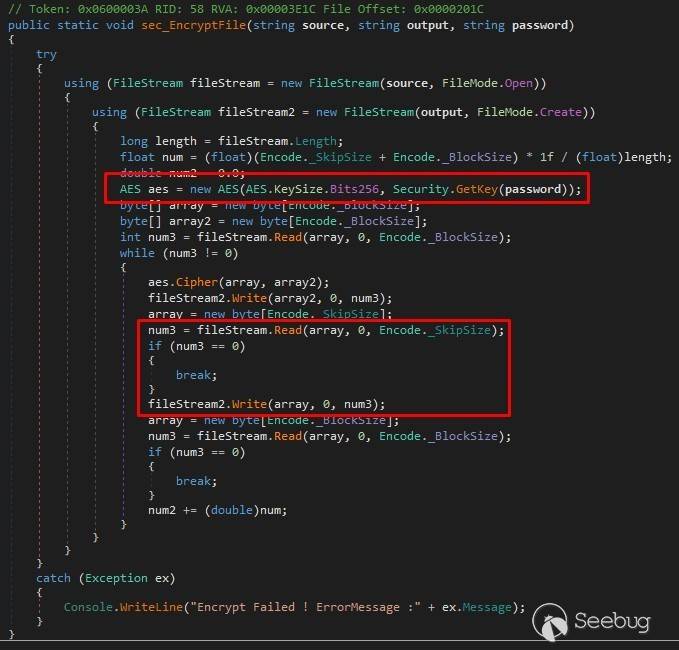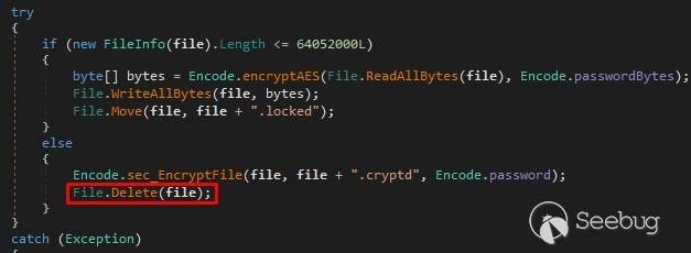 較大的文件以不同的方式加密。在這種情況下,16字節的加密密鑰是通過從基本加密密鑰中獲取前8個字節和從附加的硬編碼數組中獲取剩余8個字節形成的。隨后是AES-ECB的自定義實現。16字節的塊被加密,接下來的12800字節被跳過。結果是只加密了文件的一小部分,而不是整個文件。選擇這種方法很可能是為了加快加密過程。加密文件的擴展名為.cryptd。