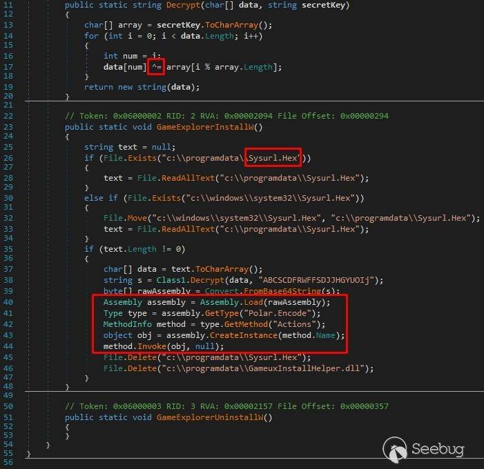 讀取文件c:\programdata\Sysurl.Hex(如果不存在,則從c:\windows\system32\Sysurl.Hex復制),然后使用密鑰ABCSCDFRWFFSDJJHGYUOIj進行簡單的XOR解密。最后用Base64解碼,生成一個PE文件,該文件通過.NET加載并在內存中運行。有效負載和中間庫在完成之前被刪除。刪除以標準(不安全)方式發生,如果及時停止磁盤訪問并且信息未被覆蓋,則可以恢復數據。