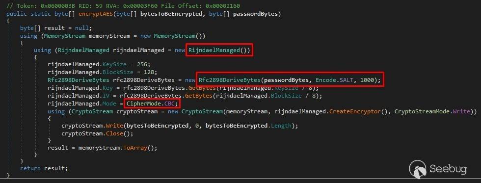 首先,我們將研究小于64052000字節(約61MB)的文件的加密方法。中間密碼是基本加密密鑰的SHA-256哈希和。它對所有文件都是相同的,并與硬編碼的salt和1000次迭代一起使用,以生成加密密鑰和初始化向量。每個密鑰都用AES-CBC加密。.locked擴展名被添加到加密文件中。