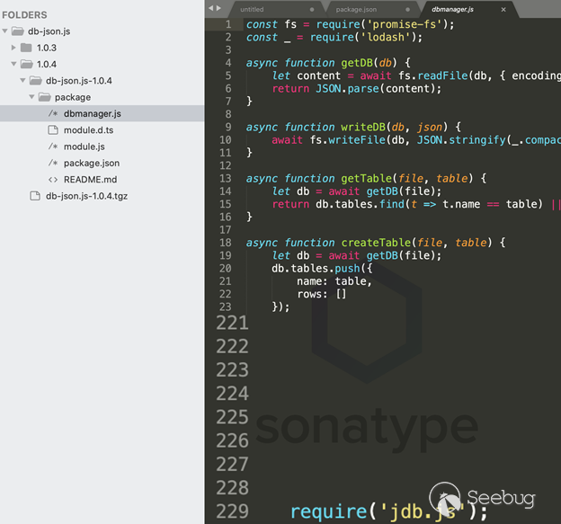 “jdb.js”試圖模仿合法的基于NodeJS的數據庫庫jdb。同樣,“db-json.js”的名稱與正版db-json庫的名稱相同。