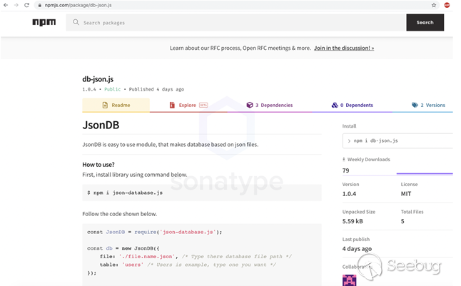 乍一看,“db-json.js”程序包看起來很干凈,因為它包含了一個真正的JSON DB創建程序包所需要的功能代碼。但是,它正在秘密地將惡意的“jdb.js”作為依賴項。