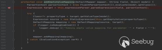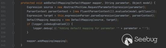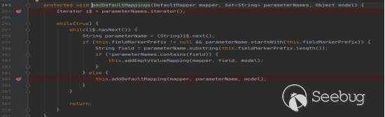 addDefaultMappings方法如上,其作用是遍歷所有的參數,包括GET參數和POST中的參數,然后一個個判斷其是否以"_"開頭,如果符合就進入addEmptyValueMapping方法進行處理,否則就進入addDefaultMapping方法進行處理。本次漏洞的觸發點是上面這一個,所以我們深入查看一下addEmptyValueMapping方法。