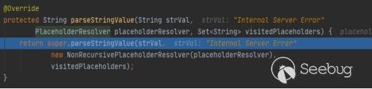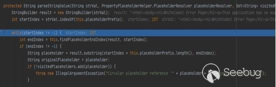 進入該方法查看,最后進入parseStringValue方法,該方法會循環將帶有${}的錯誤頁面的HTML字符串中的一個個{message}是我們傳入的值。