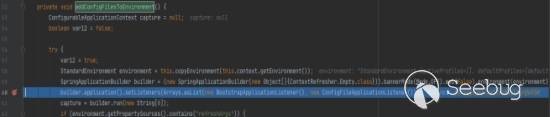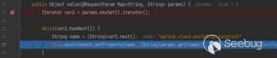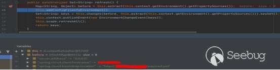 搭建環境并按上述方式進行攻擊,并搜索到spring-cloud-context-1.2.0.RELEASE.jar中的environment和refresh,然后下斷點跟進,可以發現首先的env改變會將下面體現: