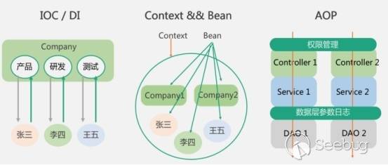 Spring將所有創建或者管理的對象稱為bean,并放在context上下文中統一管理。至于AOP就是對各個MVC架構的銜接層做統一處理,增強了代碼的魯棒性。下面這張圖就形象描述了上述基本概念。