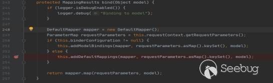 可以看到這里也對傳入的參數進行了解析但是沒有看到明顯的get方法來觸發,繼續往下尋找get方法。首先這里面將解析器放入了mapper中,下面就重點追蹤這個mapper的使用即可。