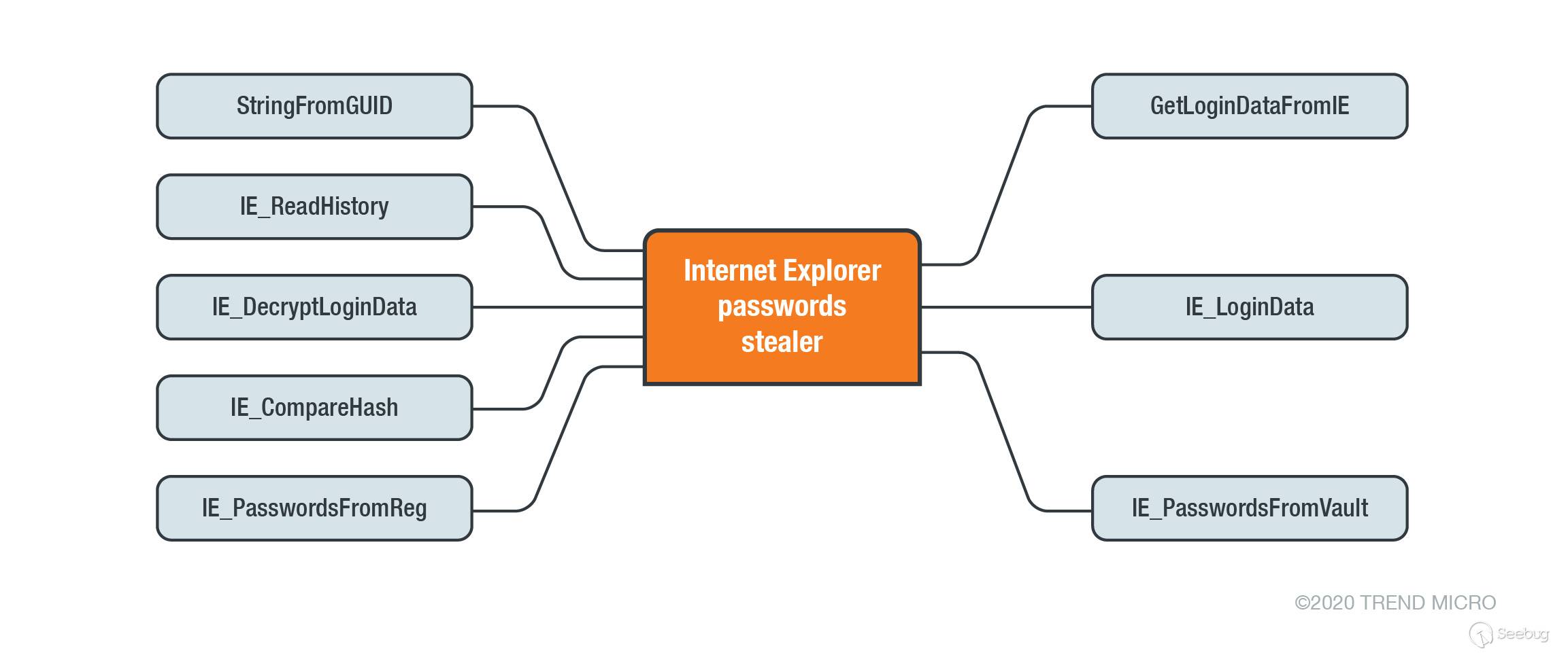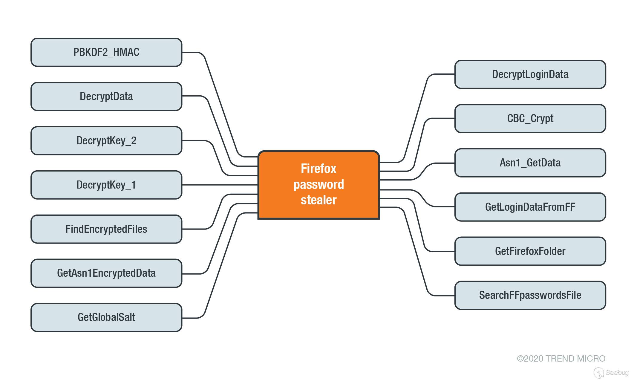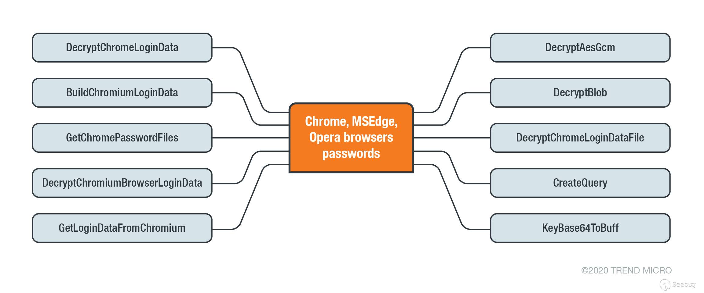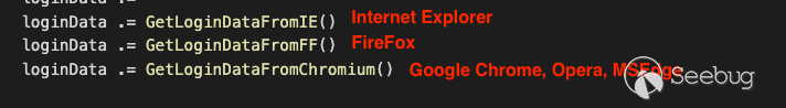 該惡意軟件的主要目的是從各種瀏覽器(例如Microsoft Edge、Google Chrome、Opera、Firefox和Internet Explorer(IE))中竊取憑據。為了實現此任務,惡意軟件使用以下功能: