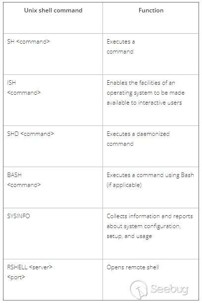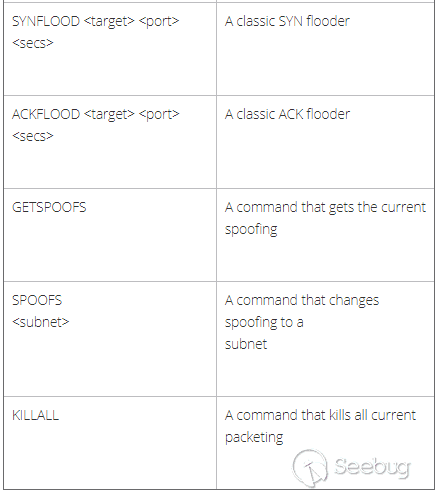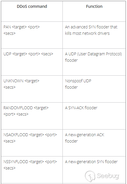這個二進制文件的最終有效負載是IRC bot,我們將其命名為TNTbotinger。這個bot具有以下DDoS命令:
