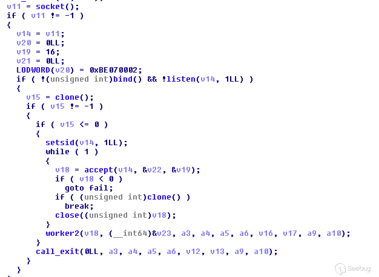 這是一個在TCP端口1982上偵聽的shell。通信使用帶有硬編碼密鑰的Blowfish加密算法進行加密。經過分析,我們發現這某些平臺上不能正常工作。二進制文件還將其進程名重命名為systemd。