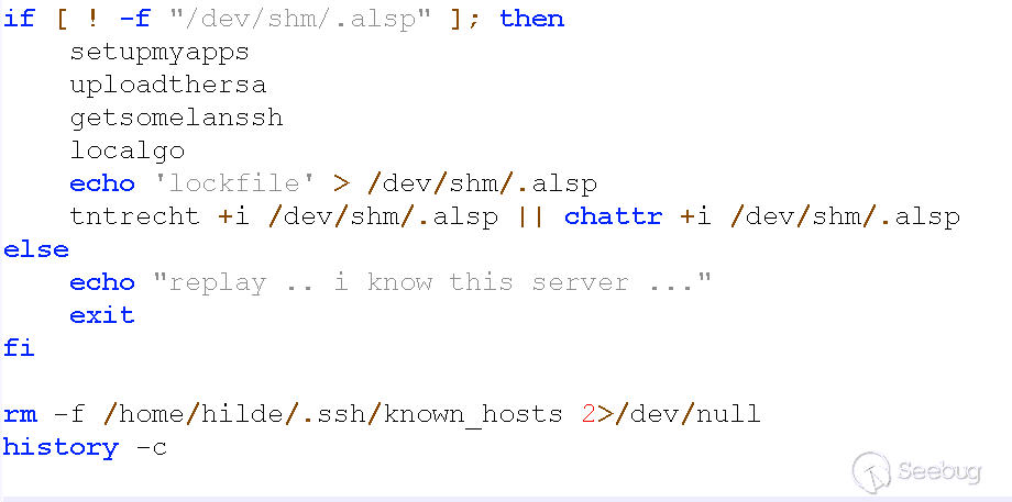 最初的傳播始于在受害者機器上運行的惡意Shell腳本。Shell腳本會檢查是否存在/dev/shm/.alsp文件。如果找不到該文件,腳本將開始執行。