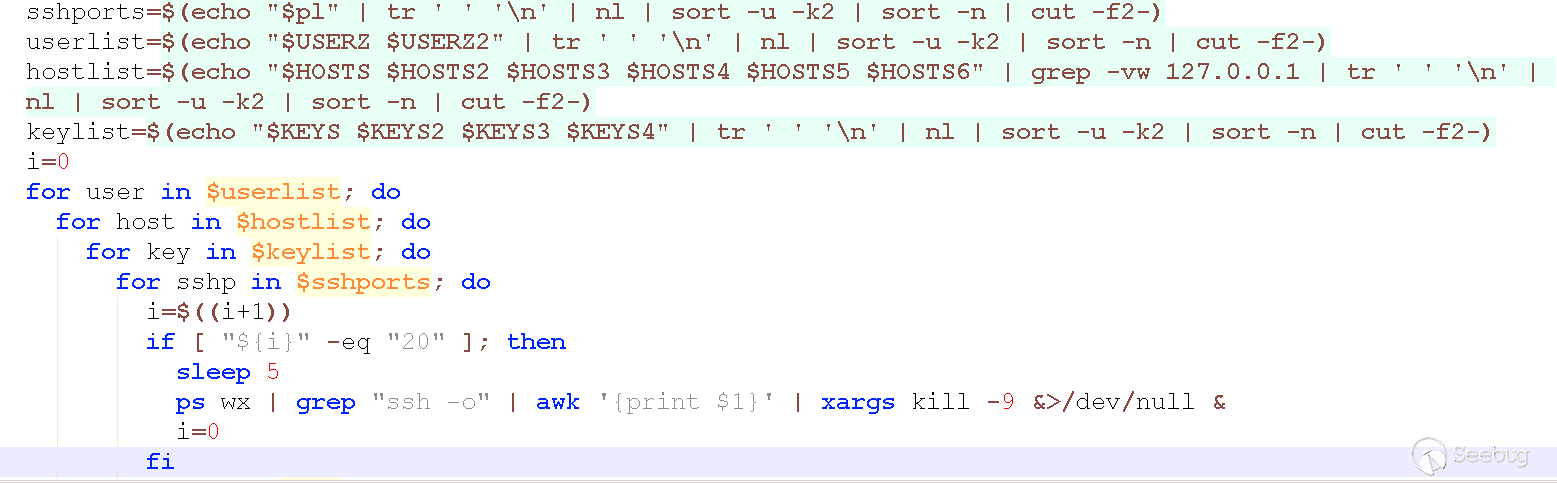 該腳本還嘗試根據ip route命令的輸出查找可訪問的設備,該命令將顯示到可訪問網絡的路由。然后將此信息傳遞給pnscan工具,以便掃描網絡上的SSH守護進程。在系統上找到的密鑰用于在新發現的設備上進行身份驗證嘗試。如果這些嘗試成功,則在新設備上部署相同的有效負載,并傳播攻擊。