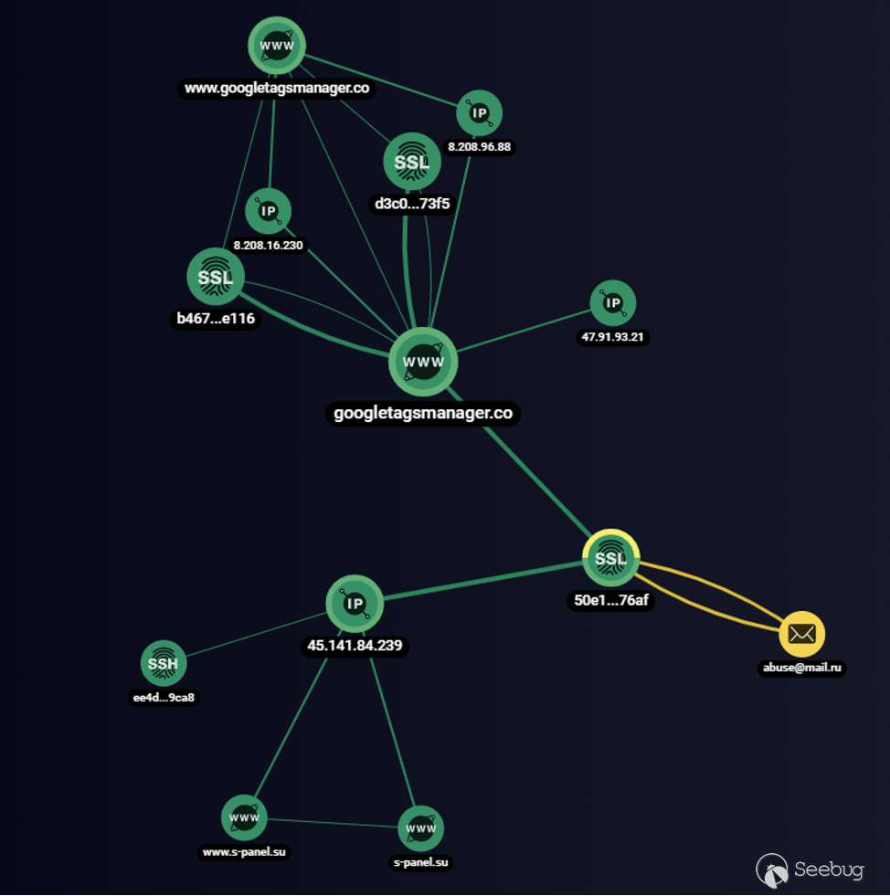 除公用服務器外,我們還檢測到一個SSL證書50e15969b10d40388bffbb87f56dd83df14576af。該證書位于googletagsmanager.co域和IP地址為45.141.84[.]239的服務器上,該服務器與s-panel[.]su域相關聯(圖7)。