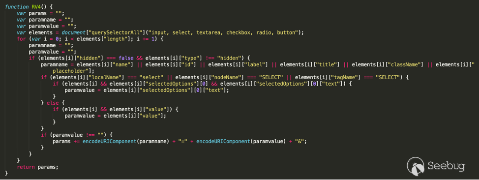 圖3顯示了負責攔截SnifLite Sniffer系列中付款信息的函數。數據收集算法基于函數querySelectorAll,就像該組織先前使用的FakeLogistics和WebRank sniffer一樣。